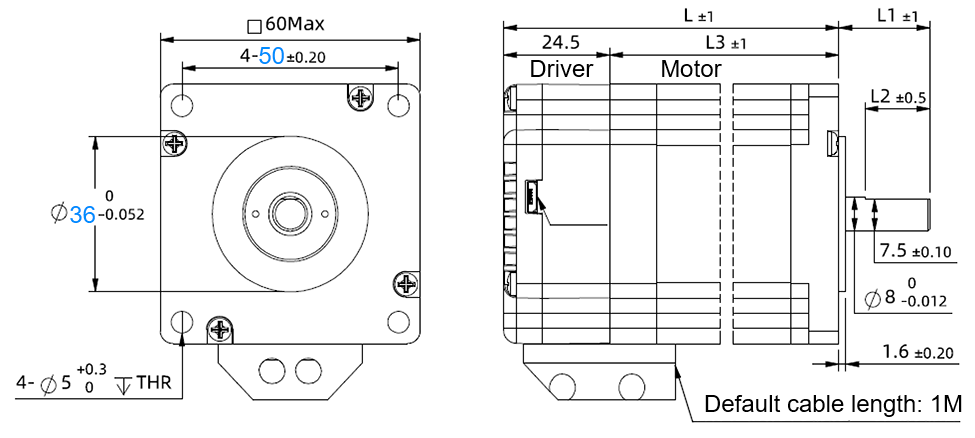 Flange Size: 36 mm;  Mounting Hole Spacing: 50 mm, drawing as below:
