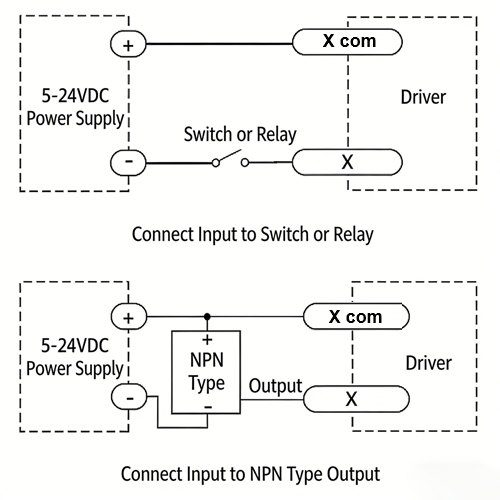 The figure below illustrates the typical wiring configurations for the X0–X2 input ports.