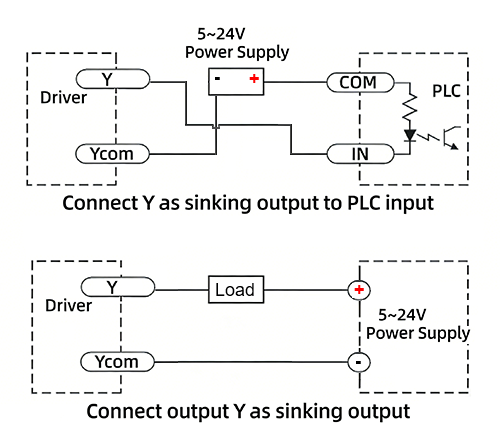 The figure below illustrates the typical wiring configurations for the Y0–Y2 output ports.